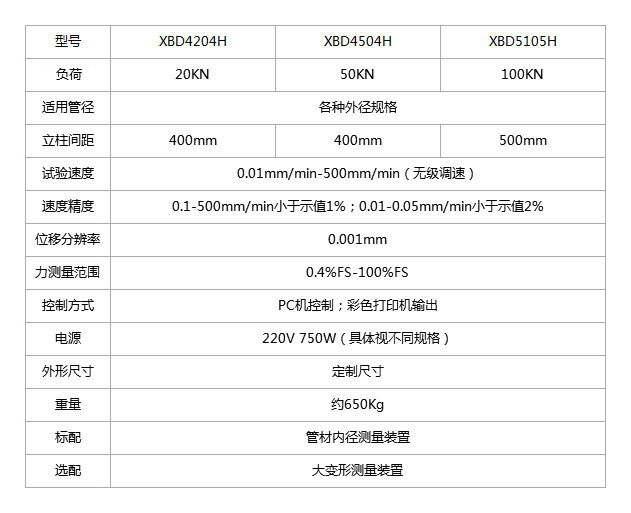 二維碼 產品名稱:微機控制電子環剛度試驗機產品型號:XBD4204H/XBD4504H/XBD5105H產品概述:微控型環剛度試驗機為雙絲杠,主機、控制、測量、操作一體化結構。適用于各種塑料管材、復合管道、玻璃鋼管材的力學性能檢測:如環剛度、環柔性、扁平及蠕變比率等試驗,以及縫的拉伸、鋼絲拉伸、鋼帶拉伸等試驗。滿足波紋管、纏繞管和各種塑料管材測試標準的要求。軟件系統具有試驗參數設定存儲、試驗數據采集、處理分析、顯示打印曲線、測試報告打印輸出等功能。該系列試驗機廣泛應用于科研機構、大專院校、質檢部門、及管...">